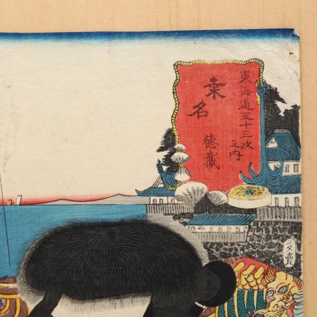 From the Collection of the late Dr. & Mrs. John J. Kane, Charleston, SC Kunisada print has been trimmed; some holes near top corners and left edge; some wear to surface; Hiroshige II prints has rubbing and wear to surface and loss, especially to the corners; dirt to surface; some fading.