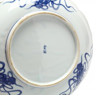 19th century, hand painted with a central reserve of two Dutchmen with a little boy located in a landscape next to a lake, two more bands of Delft inspired decoration, a dimpled rim, the exterior of the bowls have motifs of good fortune and are signed with two characters to the underside.