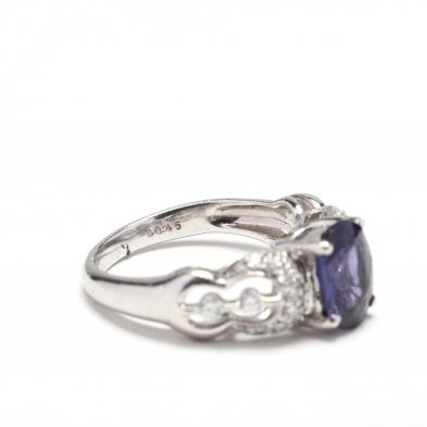 Centering on one prong set oval cut purple sapphire (9.31 x 6.95 x 3.80mm) weighing approximately 1.90 carats and with round brilliant cut diamonds weighing approximately .45 total carat (H-I color, SI-I clarity) set to the shoulders and shank, stamped Pt 900 and D 0.45 GIA Report states Sri Lanka origin and with heat treatment.
