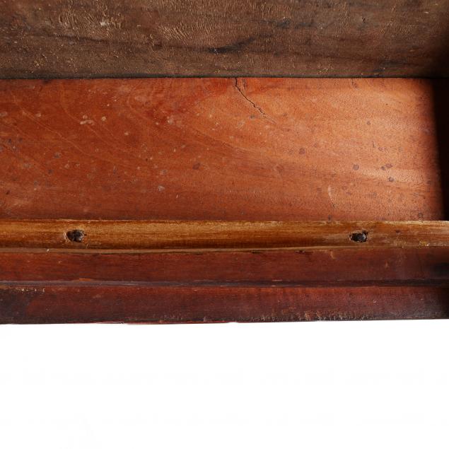 Charleston, South Carolina, circa 1750, secondary woods included: rear back board is maple, drawer sides are red gum, drawer bottom and drawer back are white pine, rectangular molded top to three sides, single long drawer with scratch bead, flush skirt, with molded corners, turned tapered legs with raised pad foot.