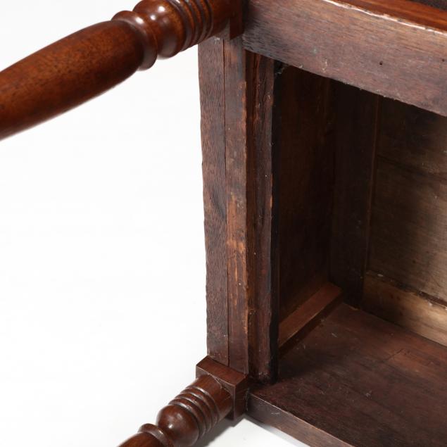 Private Collection, Charlotte, NC One burn mark to top; missing clasp; frame attached with later screws, rear spacer board likely replaced; interior case and shaped divider board refinished; drawer runners rebuilt; drawer bottom with good patina to interior but re-beveled to bottom side, likely when drawer runners rebuilt.