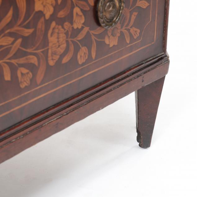 19th century, mahogany, oak secondary, rectangular case with upper applied dentil molding above six graduated cockbeaded drawers, canted corners, applied molded base, raised on short tapered feet, the top, sides, drawers, and stiles with allover urn, floral and vine marquetry inlays.