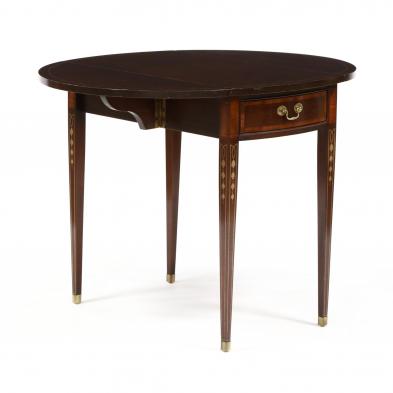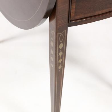 Late 20th century, top with stencil banded decoration, drop leaves with butterfly support, single banded drawer flanked by inlaid burlwood veneers, on square tapered legs with stenciled bellflower, on brass feet.
