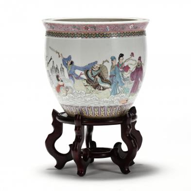 Early 20th century, finely painted with the Eight Daoist Immortals in a famille rose palette, figures are rendered in great detail to their costume and the attributes they each hold, they are featured on crossing the ocean of stylized waves each using their own unique power, combining as a team to cross the water, the lesson being a group working together is greater than the individuals working alone, calligraphy in black with red seals graces the other side of the jardiniere, with a raised wooden stand.
