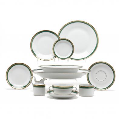 (59) pieces, Italy, white porcelain with green and gilt rim, to include eight dinner plates (10 3/8 in.); eight salad plates (7 7/8 in.); eight bread plates (6.25 in.); eight flat cup and saucers (cup 2.25 in.); eight flat cream soup bowl and saucers (bowl 2.25 in.); oval serving platter (13 in.); oval vegetable bowl (10 in.), and a cream jug.