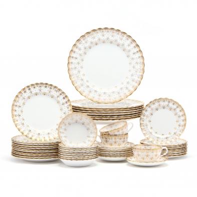 Mid 20th century, scalloped edge with gilt trim, including (8) dinner plates (10.5 in.); (11) luncheon plates (8 in.); (9) dessert plates (6.5 in.); (9) aperitif bowls (5 in.); (7) saucers (5.25 in.); and (10) teacups, marked.