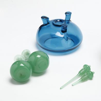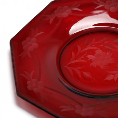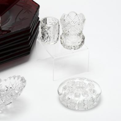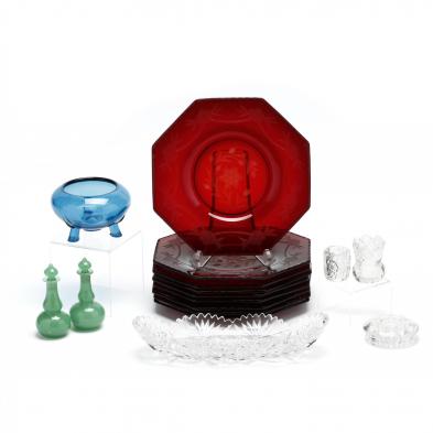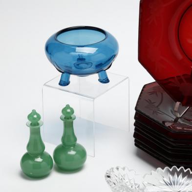 19th and mid 20th century, including a brilliant cut oval bowl, two toothpick urns, pressed glass flower frog, set of (9) ruby red cut glass plates, a blue pressed glass rose bowl, and a pair of celadon green lidded scent bottles (possibly Steuben, unmarked).