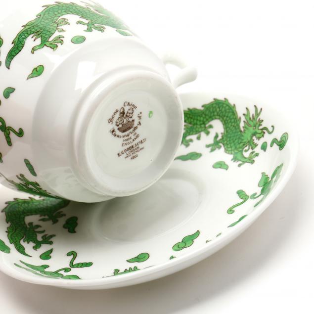 (65) pieces, service for eight, made in England, including: (8) dinner plates (10.75 in.); (8) luncheon plates (9.5 in.); (8) salad plates (8 1/8 in.); (8) dessert / pie plates (7 in.); (8) berry bowls; (8) bread & butter plates; (8) cups and saucers; and a teapot.