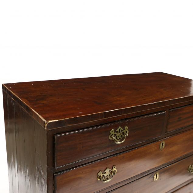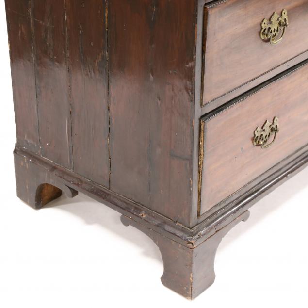 Circa 1800, oak secondary, top with edge line inlay and vertical veneered frieze, two over four graduated and cock beaded drawers, on shaped bracket feet.