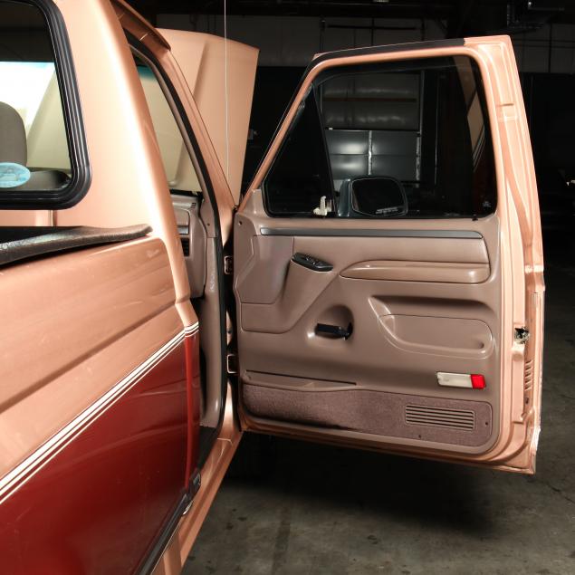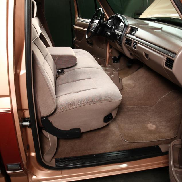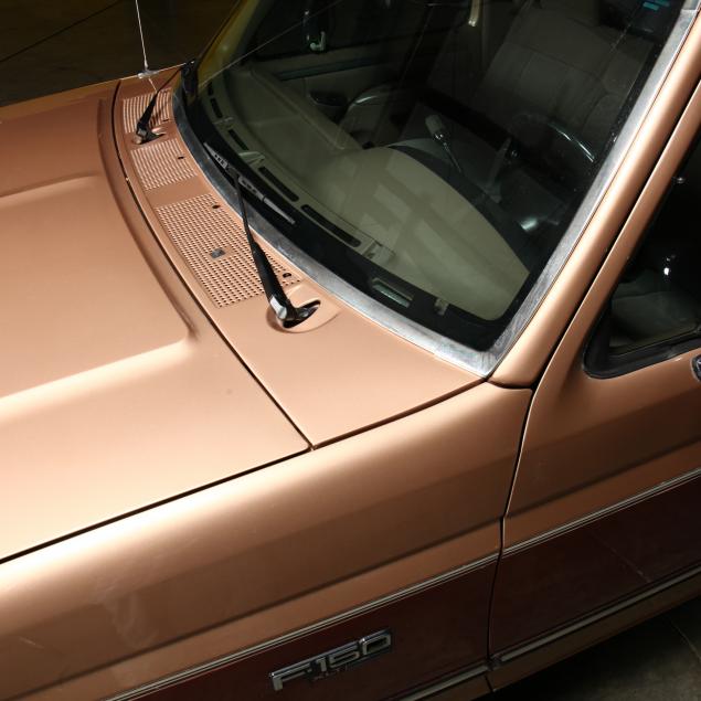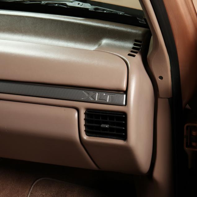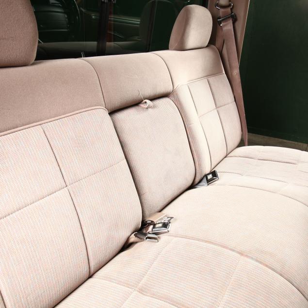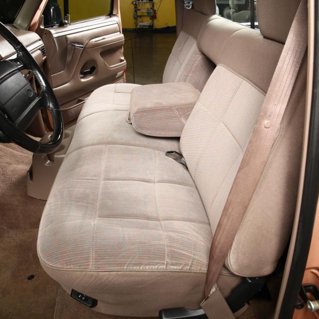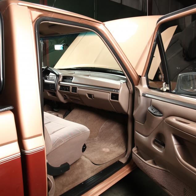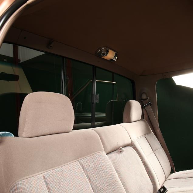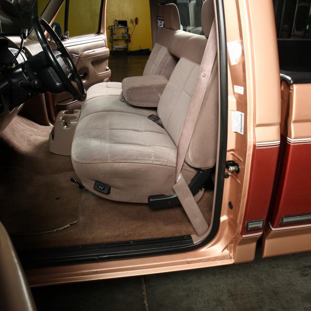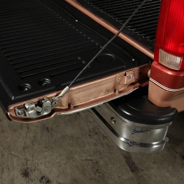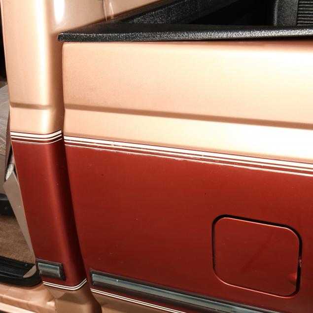 Exterior in two-tone Light Sante Fe and Medium Palomino metallic paint with chrome trim, wheels and bumpers. Interior with Saddle Brown trim and a cloth covered bench seat with folding armrest and cupholders. Equipped with dual fuel tanks, air conditioning, additional power port, power windows and locks, steering wheel mounted cruise control, original am/fm/cassette player, vent windows, window shades, and sliding rear window.