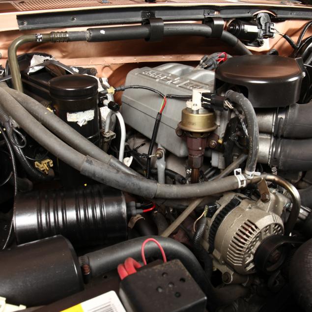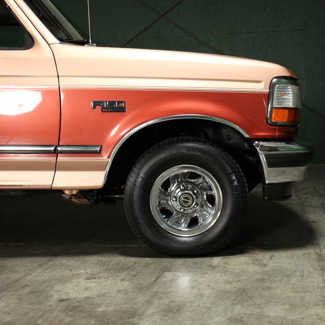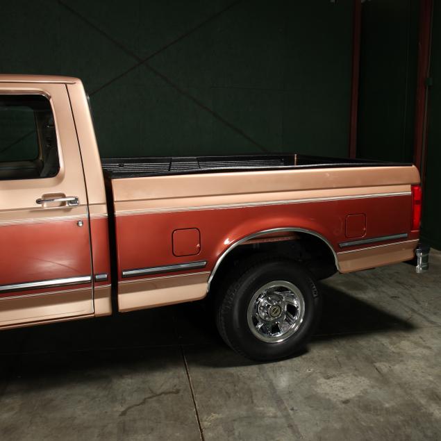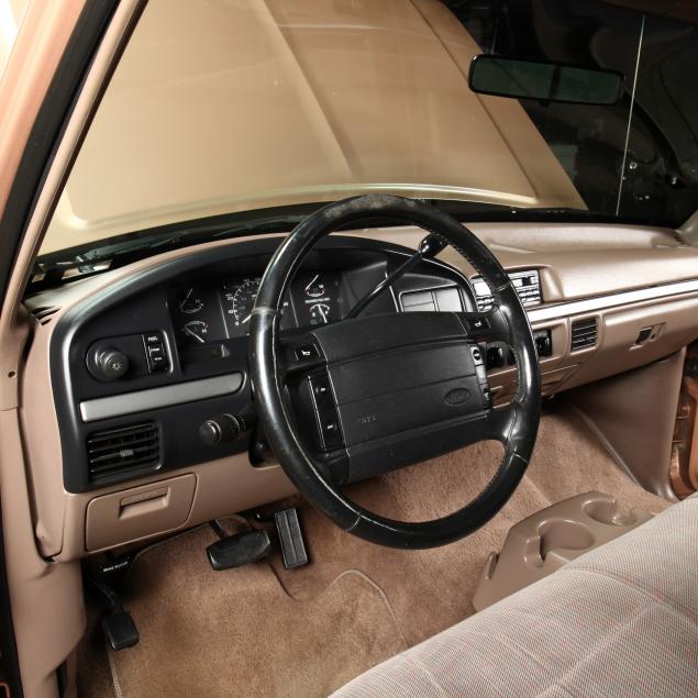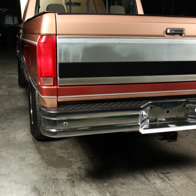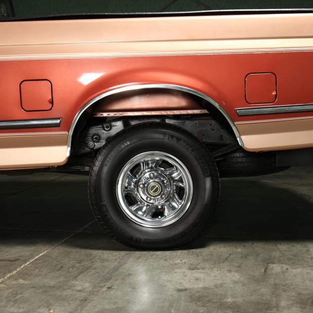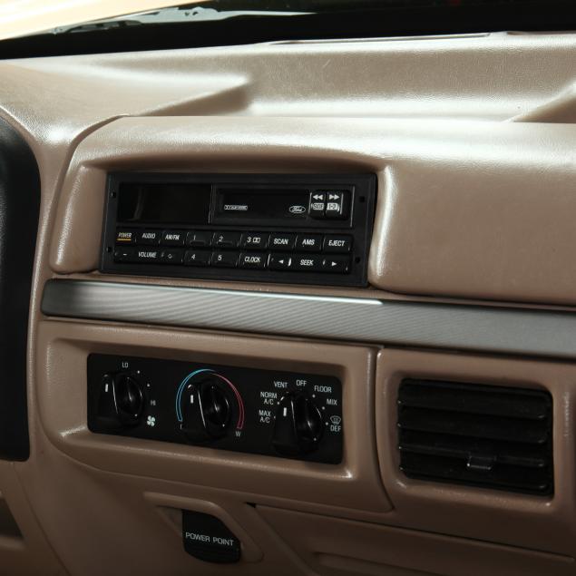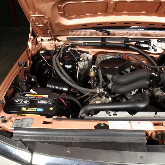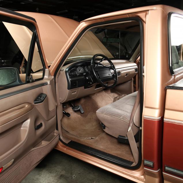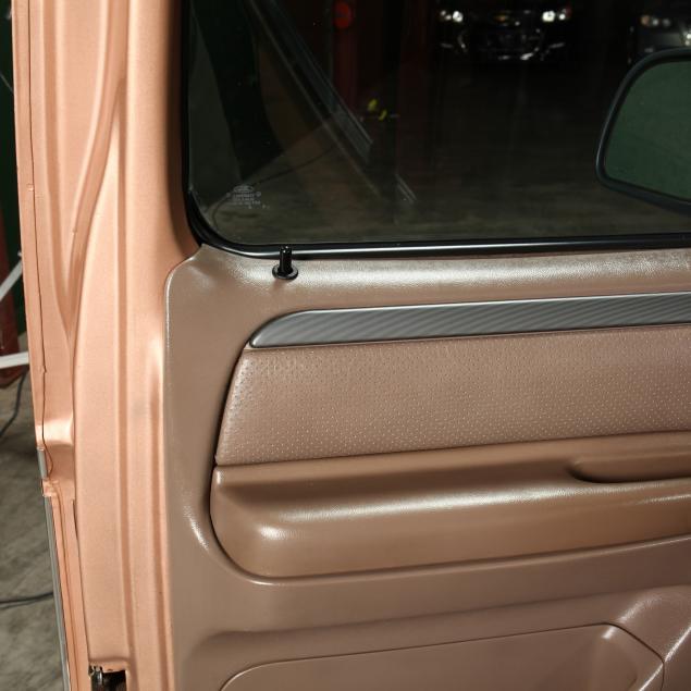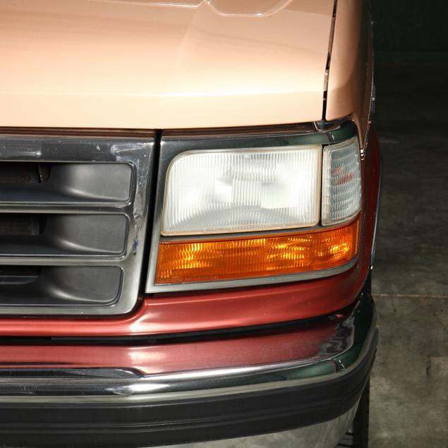 Exterior in two-tone Light Sante Fe and Medium Palomino metallic paint with chrome trim, wheels and bumpers. Interior with Saddle Brown trim and a cloth covered bench seat with folding armrest and cupholders. Equipped with dual fuel tanks, air conditioning, additional power port, power windows and locks, steering wheel mounted cruise control, original am/fm/cassette player, vent windows, window shades, and sliding rear window.