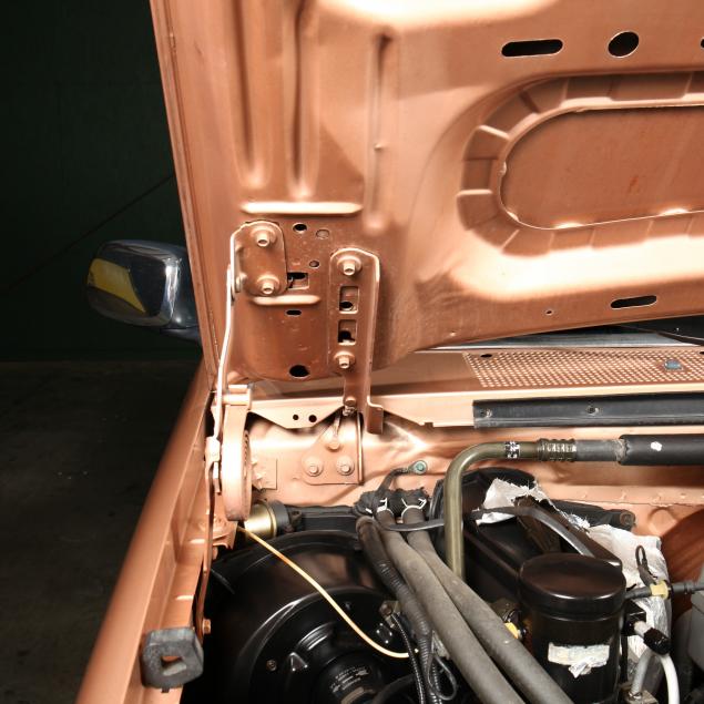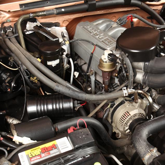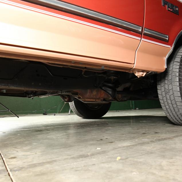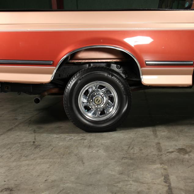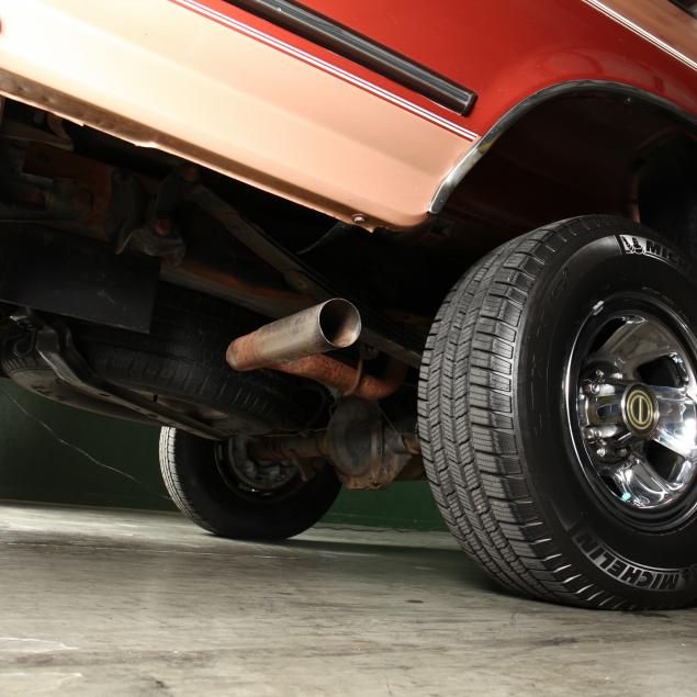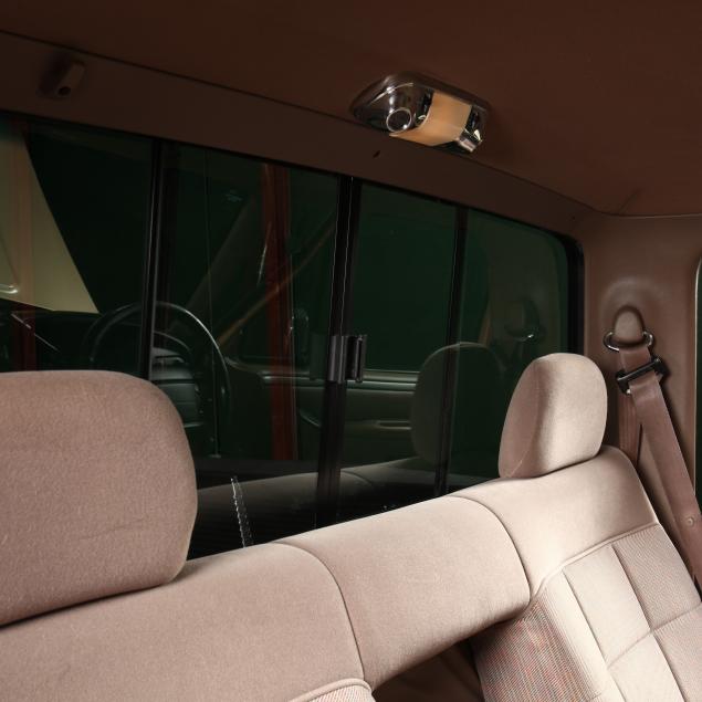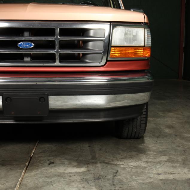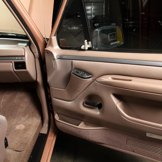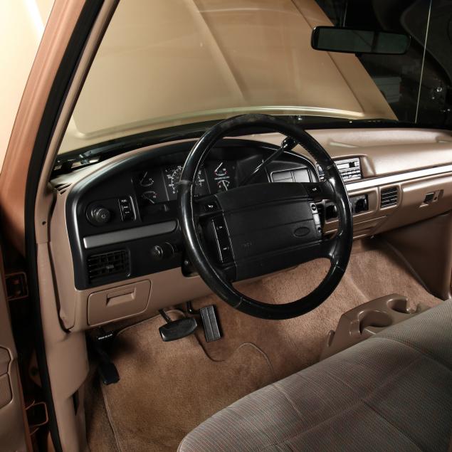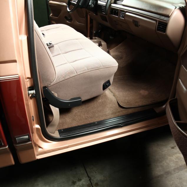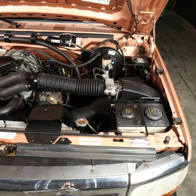 Exterior in two-tone Light Sante Fe and Medium Palomino metallic paint with chrome trim, wheels and bumpers. Interior with Saddle Brown trim and a cloth covered bench seat with folding armrest and cupholders. Equipped with dual fuel tanks, air conditioning, additional power port, power windows and locks, steering wheel mounted cruise control, original am/fm/cassette player, vent windows, window shades, and sliding rear window.