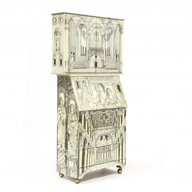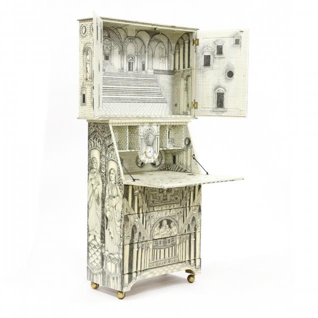 Inspired by the whimsy and wit of Piero Fornasetti, MaryLou Higgins created a very limited collection of hand-painted furniture featuring her sybil like figures amidst classical architecture.