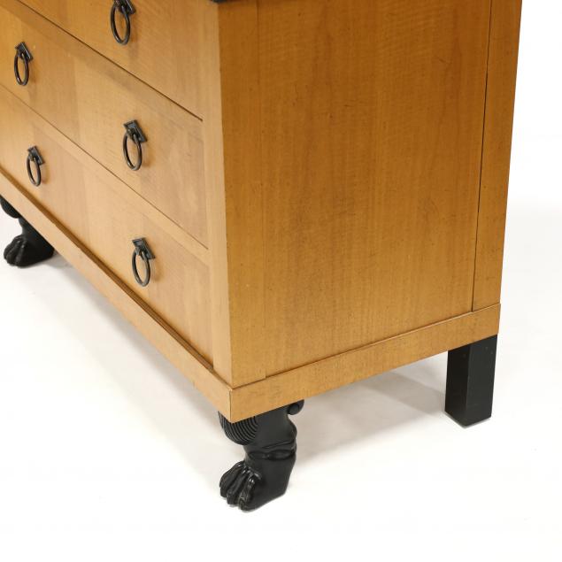 Late 20th century, dark green and black granite top, figured cherry case with ebonized highlights, three graduated drawers, raised on carved paw feet, labeled.