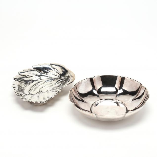 The first a sterling silver leaf dish by International and retailed by Black, Starr & Gorham (active 1940-1965), model number B128, no monogram (4.1 troy oz., LOA 6 in.); the second a Gorham "Standish" bowl, model number A13190, 1929 date symbol, no monogram (5.25 troy oz., 6 in. diameter).