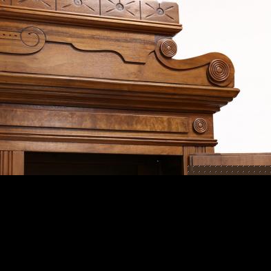 Late 19th century, burlwood veneers, multiple part form, projected pediment with incised decoration, recessed panel doors with divided and shelved interior, over two burlwood veneer doors, on flush base.