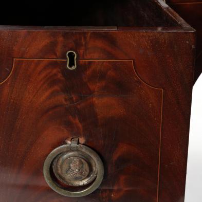 Circa 1800, mahogany veneers, oak and pine secondary, rectangular top with a vertical veneered edge, single upper drawer with light and dark wood line inlay, above two deep drawers, with interior arched valance, all with light and dark wood string inlays, raised on square tapered legs with spade feet.