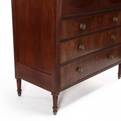 Early 19th century, yellow pine and poplar secondary, two-part form, the upper case with an applied cove molded cornice above a vertically veneered frieze, two hinged doors with astragal molded mullions and louvered shelved interior, the base with a pull-out fall front butler's desk, the interior with nine small drawers featuring tiger maple veneers, six pigeon holes with valances, flanked by two book-form document drawers, above three graduated cockbeaded drawers, reeded stiles, paneled sides, raised on reeded turned front legs.