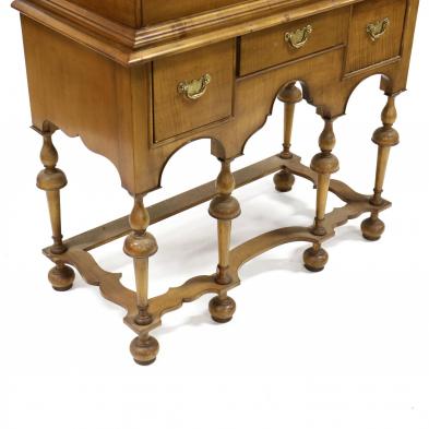 Mid 20th century, one-part form, molded cornice, two over three over three drawer configuration, chased brass pulls, on tall turned legs with shaped stretcher base and onion foot.