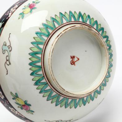 Including a pair of figures on oxen, marked "China," 20th century (5.25 in.); a famille noir bowl, marked to base, 20th century (3 5/8 x 8 5/8 in.); a Rose Medallion plate, circa 1900; and a carved nephrite jade lotus leaf (5 in. across) (some nicking and chipping to edges).