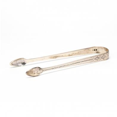 The pair of sugar tongs with London (1796) hallmarks, "SH" sponsor's mark, with period bright cut engraving and period "SB" monogram (LOA 5 7/8 in.); the sugar bowl with London (1884) hallmarks and "JS" sponsor's mark (2.75 x 4.25 in. diameter).