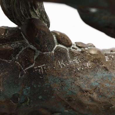 With applied golden patina, signed "(illegible) Kenzie" and dated 1976, multi-part casting and assembly.