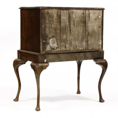 18th century, top with matched oyster veneers and banded border, with vertical veneered molded edge, two deep long drawers with vertical veneering and banded border edges, upper case inset into a frame, with molded top edge, shaped skirt, four tall cabriole legs, all with relief carved knee, on pad feet.