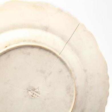 Victorian transfer ware with faux Wedgwood impressed stamp (Wedgewood), "Fruit Basket" pattern, to include: three plates 8 5/8 in. (all with damage); nine plates 9 5/8 in. (six with crack); a platter, damaged.