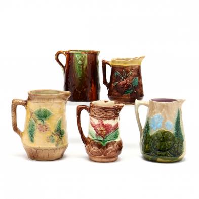 Late 19th century, eight plates dessert or salad size (four damaged); five pitchers (rim repairs or chips); two Majolica reference books.