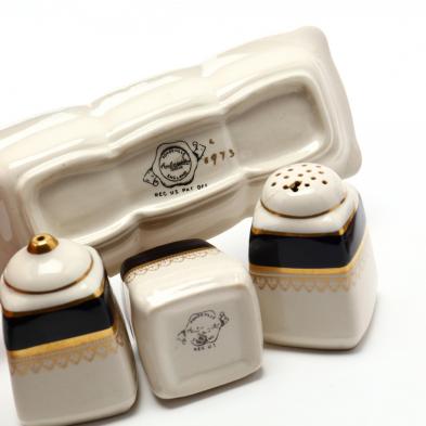 Good estate condition; salt shaker with damage to top; two saucers with staining and crazing; one dinner plate with crack at edge; three luncheon plates with staining; many pieces with crazing.