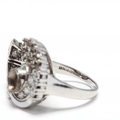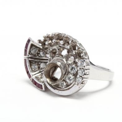 A swirl motif mounting with loose and mounted old European cut diamonds and square cut synthetic rubies, stamped 10%IRID. Total diamond weight approximately 1.18 carats (J-K color, VS-SI clarity).