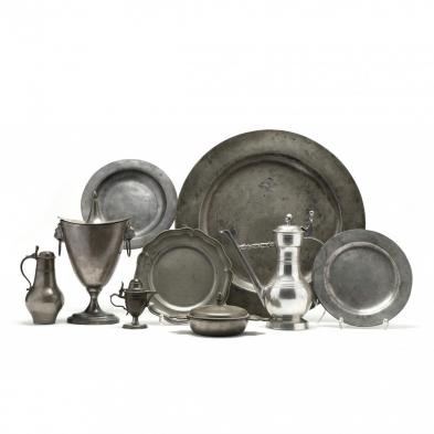 Including a large 18th century charger, three 18th/19th century plates; an 18th century lidded porringer; an 18th century lidded cream jug; a 19th century lidded milk jug; a 19th century lidded urn with lion mask handles; and a 20th century figural pitcher; with hallmarks.