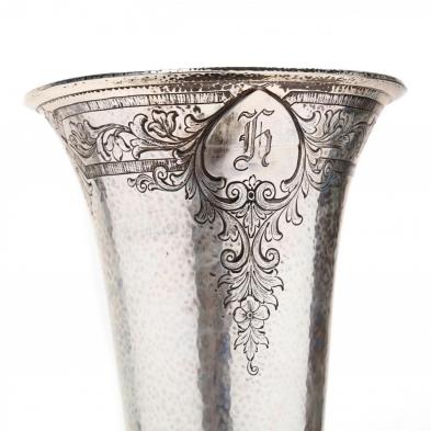 1916 date symbol, model number 1371 A, period "H" monogram, hammered finish with foliate scroll engraving to foot and flared mouth.