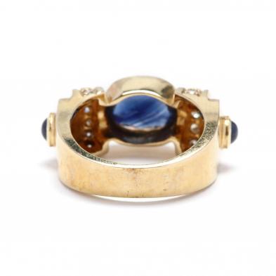 The oval sapphire (10.0 x 8.0mm) weighing approximately 1.69 carat bezel set horizontally to the front, and with diamond detailing and cabochon sapphires set to each end, stamped 14K.