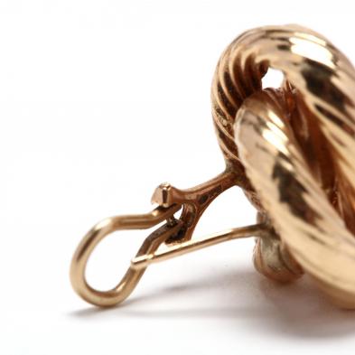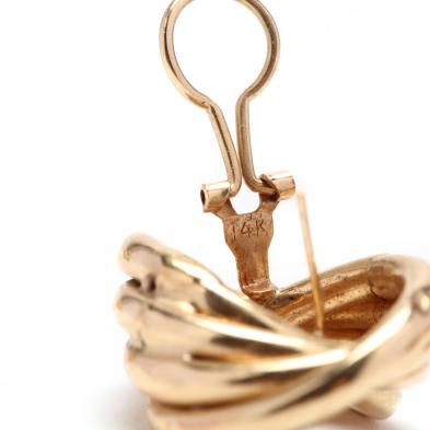 To include: a pair of knot motif earrings with posts and Omega backs, stamped 14K (1 in.); a pair of interlocking circle motif earrings completed with posts and Omega backs, stamped 14K (7/8 x 1.25 in.); and a pair of door knocker style earrings completed with posts and Omega backs, stamped 14K (1 1/8 x 1.25 in.).