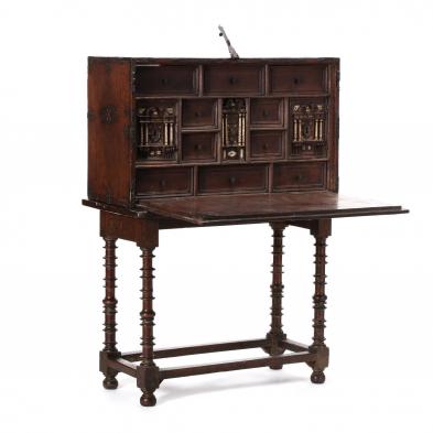 17th century, dovetailed case with iron mounts and straps, fall front lid with geometric and armorial inlays, interior with eleven drawers and two hinged cabinet doors featuring carved bone and ebony inlays, on an old likely later walnut stand with geometric inlaid skirt, ring turned legs with box stretcher and suppressed ball feet.