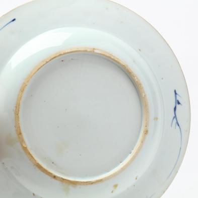Includes two 18th century blue and white Chinese Imari plates made for the European market, two 19th century bowls with blue and white hand painted decoration of flora and bamboo, and a small lobed baluster vase finely painted with a landscape scene, with a metal fitting around the rim.