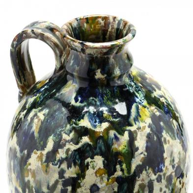Cole Pottery, Sanford, spatter glaze, a pitcher (7 in.) and a tall jug (17 in.), both inscribed on the bottom.