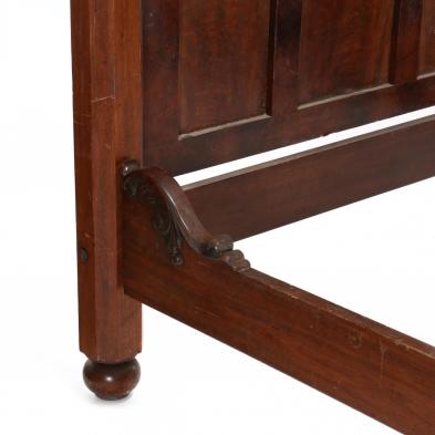Caswell County, North Carolina, mid-19th century, seven-part form, triple paneled back headboard with Gothic arches, set within two octagonal posts, the headboard arched and with applied scrolls, floral, and fruit decoration, center carved cartouche with oval medallion, low footboard with similar applied scrolled and carved designs to each side, each post with distinctive turned finials and suppressed ball feet, with two shaped side rails.