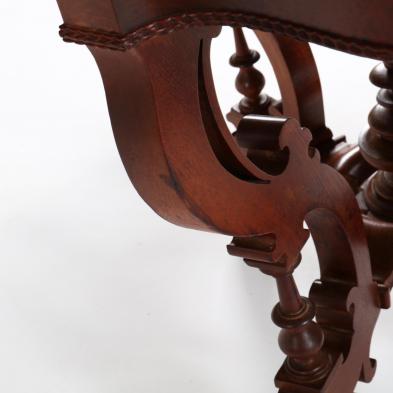 Caswell County, North Carolina, mid-19th century, poplar secondary, shaped white marble turtle top, vertical veneered skirt with applied lower molded edge, raised on four shaped and pierced distinctive leg supports, center stretcher with distinctive turned finial, scrolled feet, on casters.
