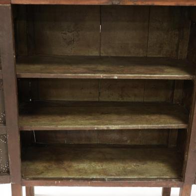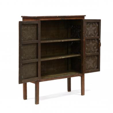 19th century, white pine and mixed woods, case with twelve star design punched tins, shelved interior, straight legs, with remnant of old green paint.