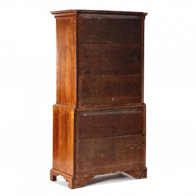 Attributed to New Hampshire, late 18th century, white pine secondary, two-part form, applied cove molded cornice, unusual large upper drawer with faux five small drawer configuration, with center relief carved stylized fan, above three graduated drawers, all with molded lip, the base with four graduated lipped drawers, applied molding to top and base, raised on later shaped bracket feet.