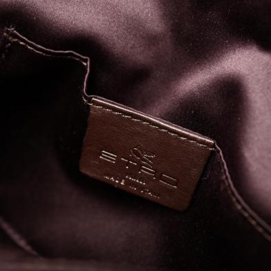 An Etro chocolate silk bag with tapestry flap (5 x 8.75 in.) (strap bent); a Judith Leiber navy evening bag with crystal top frame and braided removable shoulder strap, new with Bergdorf Goodman tag (4.5 x 6 in.); a Lionna, made in Italy, hard sided handbag, calfskin with gold detail, stationary handle (wear to leather on handle, some interior stains) (HOA 9.75 x 8.75 in.); an Anya Hindmarch, made in England, bronze sequined bag with bow, gold leather trim (sequin loss at one edge).