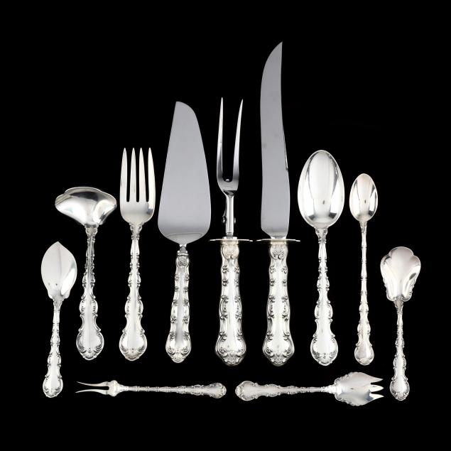 (107) pieces, service for twelve, including: (12) knives (9 in.); (13) forks (7 in.); (12) salad forks; (24) teaspoons; (12) cream soup spoons; (12) butter knives; (6) iced tea spoons; (5) tablespoons; (2) ice cream forks; (2) lemon forks; serving fork; sugar spoon; jelly server; gravy ladle; pie / cake server; and two-piece carving set. No monograms.