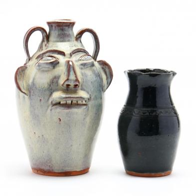 A slip glazed face jug, buggy jug form with china teeth (12 in.); a vase with scalloped rim and decorative band at mid-section (8 in.).