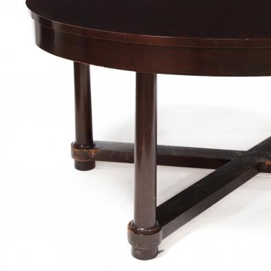 Late 20th century, mahogany, oval top, opens to accept two leaves, raised on turned legs with cross stretcher base, labeled.