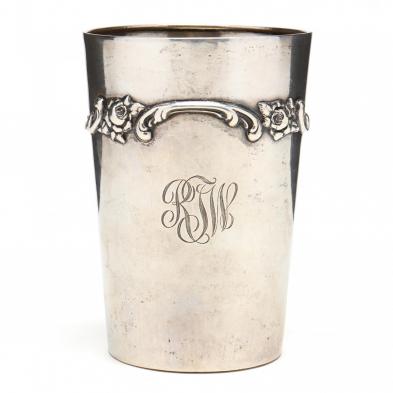 Hallmarked, 2 1/2 gill capacity, period script monogram "RTW," with applied floral and scroll motif below rim.