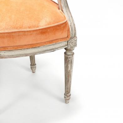 20th century, oak with an antiqued white painted surface, pink plush upholstery on five fluted legs.