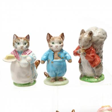 Eight figures by Beswick, made in England, including Timmy Tiptoes, Mrs. Rabbit and Bunnies, Pigling Bland, Ribby etc. Also in the group is a Wedgwood Beatrix Potter theme cup "The Kitten".