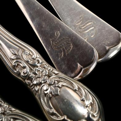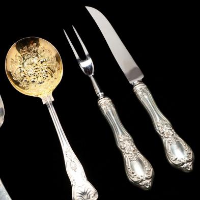 Including a Gorham "Jac Rose" sterling silver fish serving set with "S" monogram (6.15 total troy oz.); a two-piece sterling silver handled carving set in the "Old Empire" pattern by Poole; an English parcel gilt silverplate berry spoon; (2) unmarked silver baby rattles; and (6) unmarked silver flower form pins.